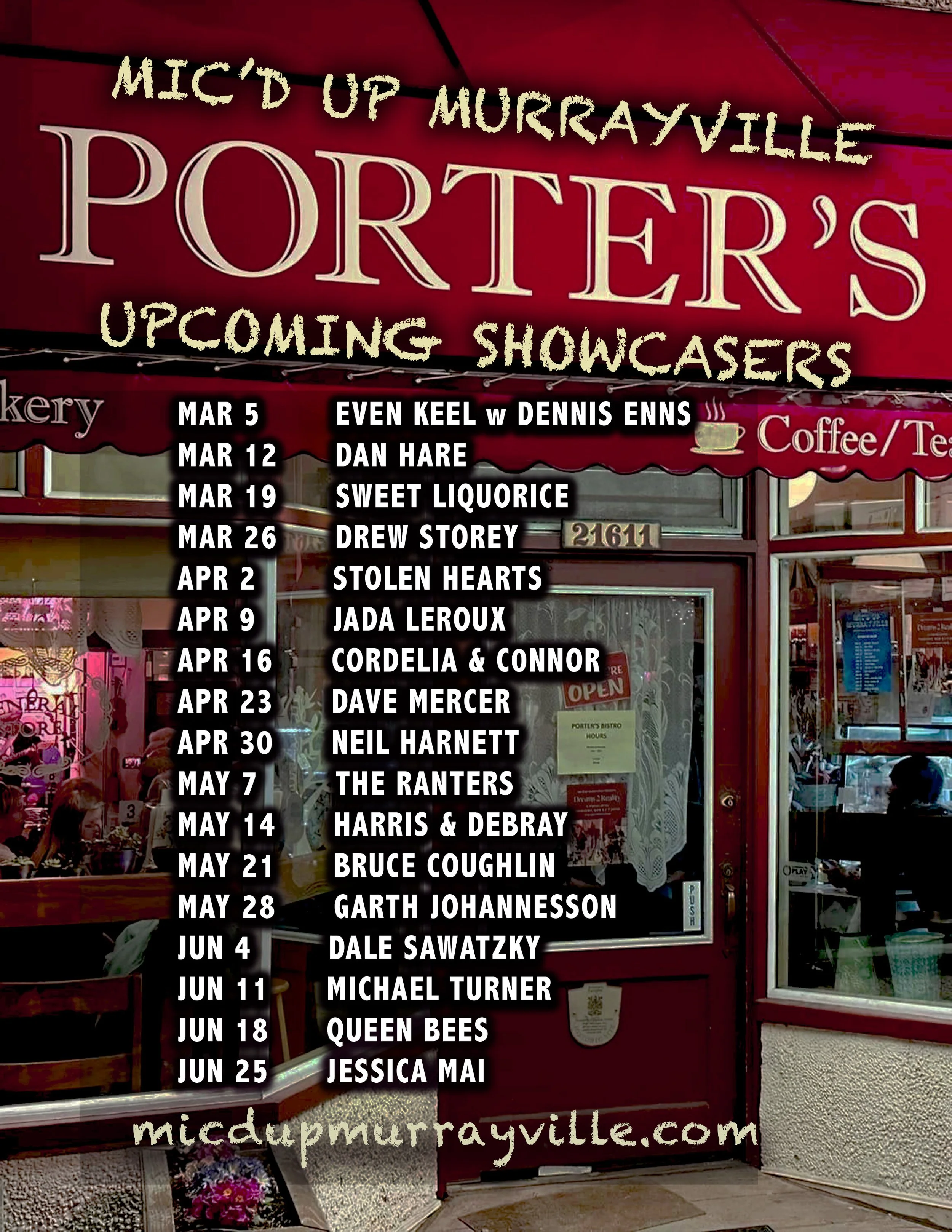 Welcome to Mic’d Up Murrayville, the heart-and-soul live music night that turns Porter's Bistro into the kind of place where magic happens — every Thursday. Hosted by Shannon Lee and backed by our warm and spirited house band, Porter’s Special Blend, this is where local musicians take the stage: whether you’re a seasoned pro, a shy newcomer, or want to feel the thrill of having a band behind you.